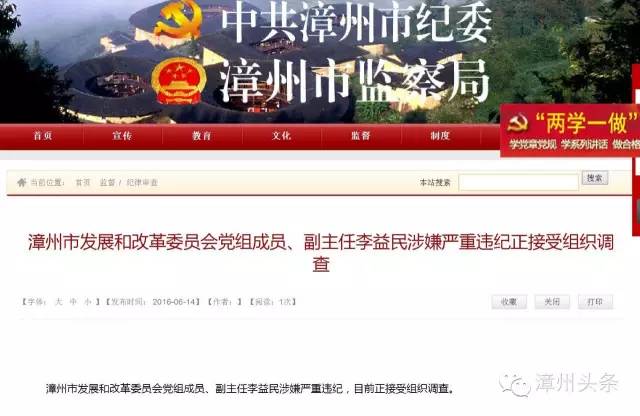 漳州頭條從中共漳州市紀委、漳州市監(jiān)察局網(wǎng)站獲悉,州市紀委今天早上剛剛權威發(fā)布,漳州市發(fā)展和改革委員會黨組成員、副主任李益民涉嫌嚴重違紀,目前正接受組織調(diào)查。
